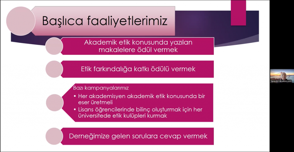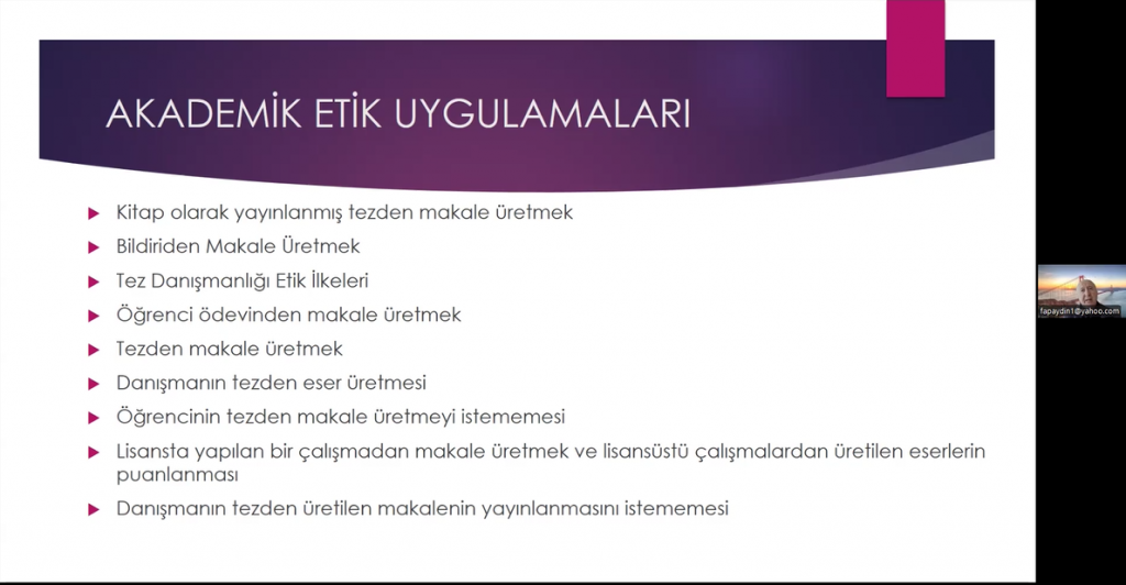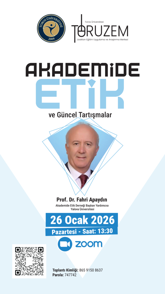 Toros Üniversitesi Uzaktan Eğitim Uygulama ve Araştırma Merkezi (TORUZEM) ve Toros Üniversitesi Öğrenme ve Öğretme Koordinatörlüğünün koordinesinde tüm akademik personelimize yönelik olarak “Akademide Etik ve Güncel Tartışmalar” konulu eğitim sunumu , Yalova Üniversitesi Akademide Etik Derneği Başkan Yardımcısı Prof. Dr. Fahri APAYDIN tarafından online olarak gerçekleştirilmiştir. Katılımcılara ( 30 katılımcı) konuyla ilgili katkıda bulunacak bilgiler vermiştir.